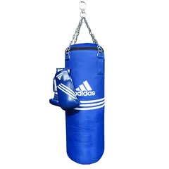 Adidas Box Set "Blue Corner Boxing Kit" är gjord av ett tåligt och slitstarkt canvasmaterial. Dessutom är boxningssäcken fylld med textilier - det gör att boxningssäcken har optimal slagtålighet. Boxningshandskarnas förstärkta skuminlägg garanterar säkerhet och komfort under träning.
