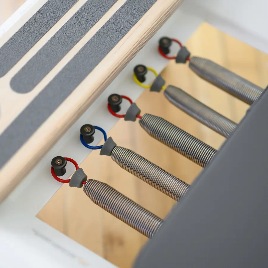 -Uppsättningen innehåller följande fjädrar: 1 gul (mycket lätt motstånd), 1 blå (lätt motstånd) och 3 röd (medel motstånd)