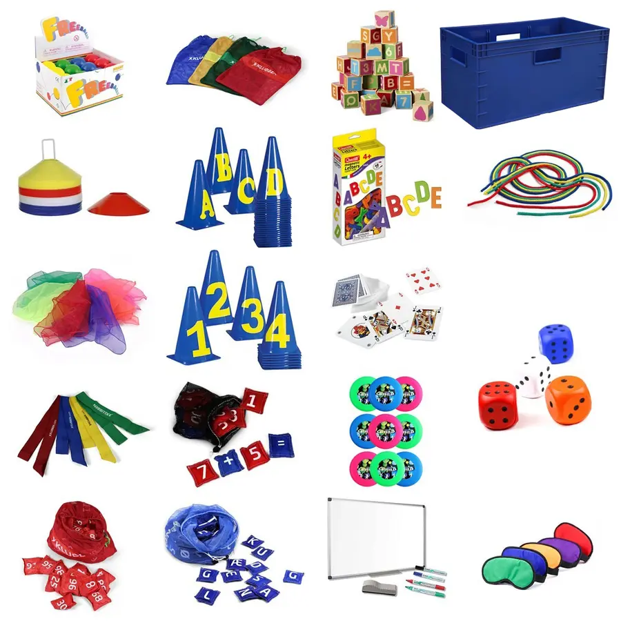 Stort utrustningspaket i stor låda för Aktiv inlärning. Detta är en aktivitetslåda som har utvecklats i samarbete med Högskolan vid Center for Practice-orienterad idrottsvetenskap, nätverk och innovation (SPINN). Aktivt lärande är lärande stödjande aktiviteter som genom lekfulla övningar bidrar till variation och kreativitet i undervisning och träning.