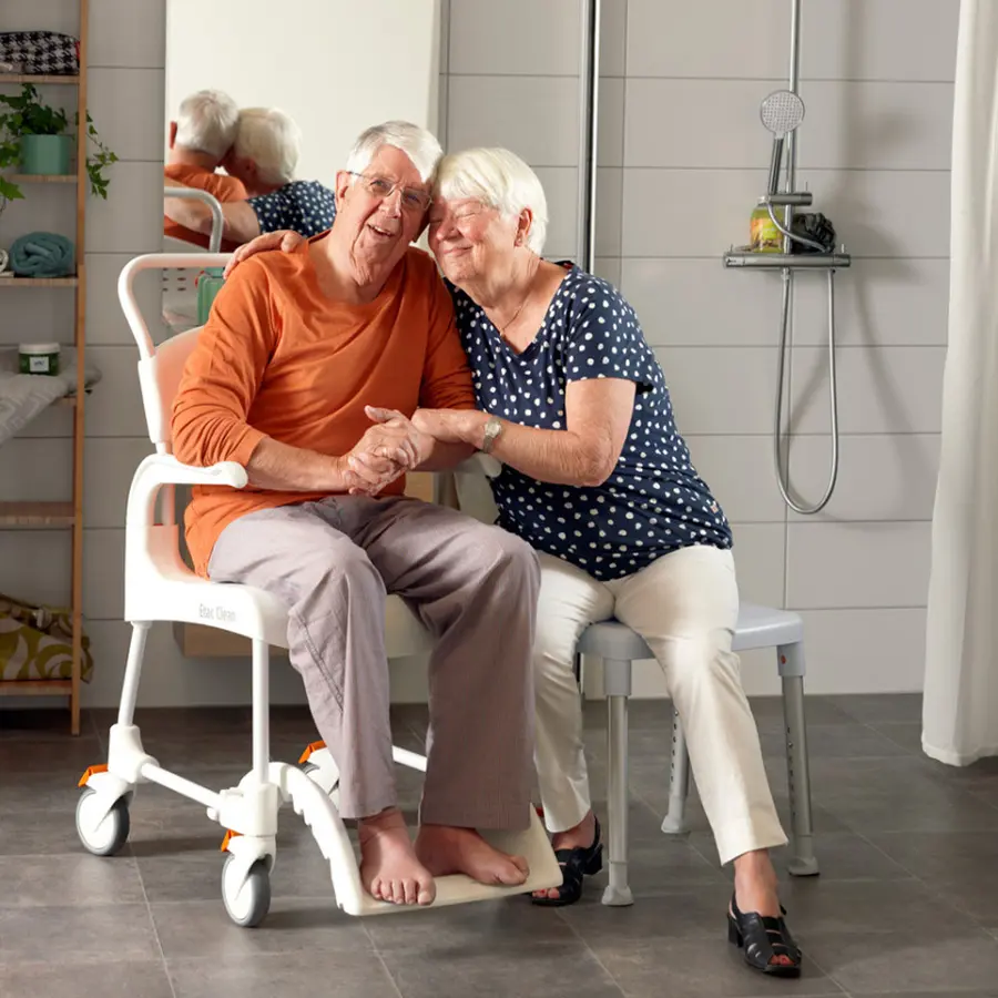Clean är den nya generationen av dusch- och toalettstolar. Säkert, säkert och enkelt. Varje detalj i stolen är designad för att underlätta för både användare och vårdare när de duschar och går på toaletten. Sitsen är helt öppen baktill, vilket gör den lättillgänglig för vårdgivare för intim hygien. Situationen blir också mindre besvärande för användaren. Fotstödet är alltid på plats och kan enkelt skjutas in under stolen när du inte behöver det.