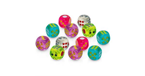 Transparenta och coola tärningar med studs. Tärningarna kan användas som speltärningar, till lek eller som studsboll.