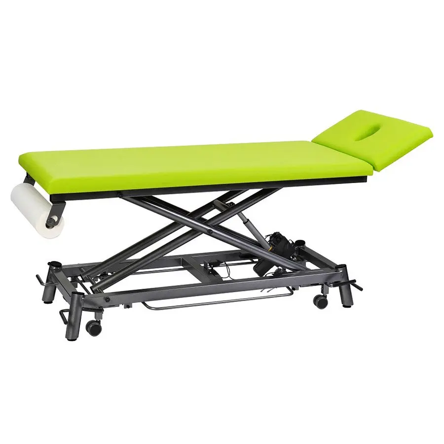 Behandlingsbänk EcoFresh för massage och sjukgymnastik i hög kvalitet och modern design. Bänken är stabil och lätt att använda. Bekväm liggyta med 7 cm vaddering och justerbart nackstöd från +45 till -90 grader. Elektrisk höjdjustering med handkontroll, från rullstolsanvändare höjd 48 cm till 103 cm. Nackstödet har hål för ansiktet. Massivt saxlyftsystem med underhållsfria lager garanterar lång livslängd. Överdraget av antimikrobiellt konstläder är lätt att tvätta och desinficera.