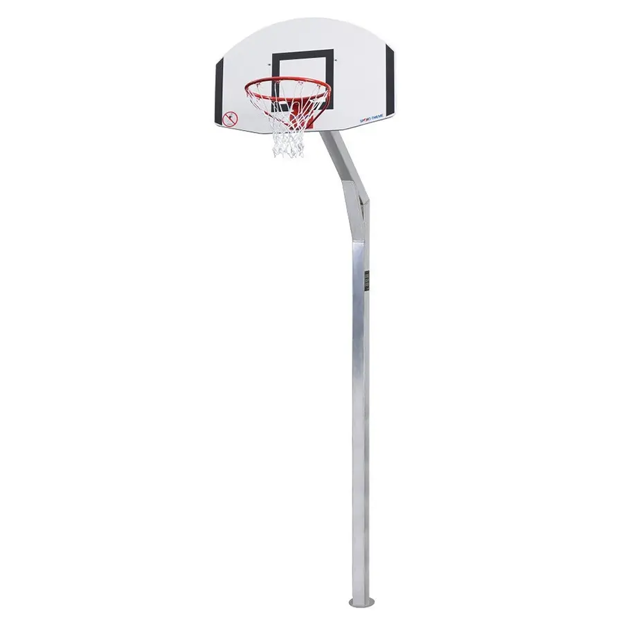 basketställning i aluminium, för skolgårdar och lekplatser. Med stabil GRP planka, korg och nät. Inklusive markhylsa 500 mm, 65 cm överhäng, korghöjd 305 cm, ingen höjdjustering.