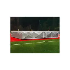 Mobilt förvaringshus för höjdhopppsmatta skyddar perfekt mot väder och skador. Den har en stängt aluminumkonstruktion och består av 2 delar som kopplas ihop med ett lås. Taket är gjord av sidoväggsprofiler på en aluminiumsram och sidorna av aluminiumskasetter. Detta skyddar höjdhoppsmattan mot väder och avsiktlig skada och skadegörelse. "Garaget" är inte vattentätt, endast vattenavvisande så ett regnskydd till mattan rekommenderas.