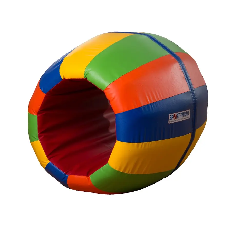 Barn kan balansera, rulla, krypa igenom eller dyka över Sport-Thieme "Rainbow" gymnastik och lektunna. Rullen består av en fast skumkärna och är täckt med ett hudvänligt ovanmaterial (100 % polyklorid). Lektunnan är lätt att rengöra efter användning.