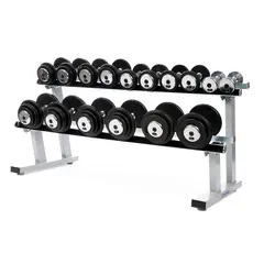 Dubbel hantelstativ för förvaring av hantlar i olika viktklasser. Stativet är praktiskt med sluttande hyllor. Stabil konstruktion av stål. Lutande hyllor ger bra ergonomiskt utnyttjande. Utrymmen kan anpassas till de olika manuella storlekarna. Varje hylla kan lastas med upp till 150 kg. Bekväm förvaring av fria vikter för gym, fitnesscenter, klubbar, studior och privatpersoner.