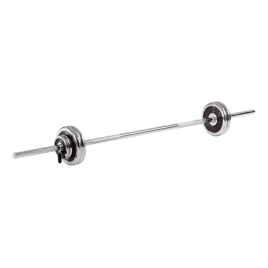 Sport-Thieme viktset 27,5 kg krom för användning hemma och på gymmet. Setet innehåller en spak på 160 cm i förkromat stål, med räfflat greppfält för bättre grepp och tillväxtskivor i krom med gummiinlägg. Viktskivorna har hål på 30 mm och är snygga att använda på hantlar/manuella stänger också. Totalvikten med stång och brickor är 27,5 kg.
