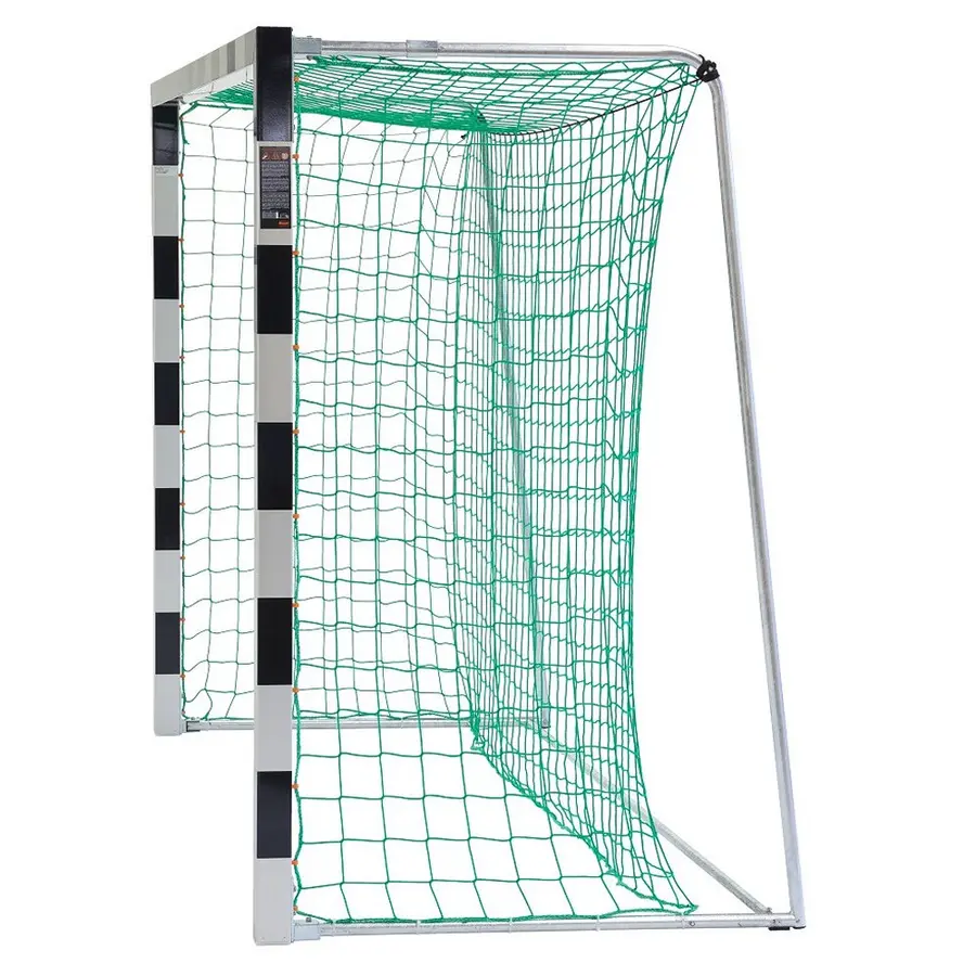 Fristående handbollsmål av aluminium med nätbågar av stålrör, enligt standard EN 749, med patenterade hörnkopplingar som gör målet extra stadigt. Under spel är det korsningen vid stolpen och ribban som utsätts för störst belastning. Solida hörnkopplingar är därför extremt viktiga och de garanterar stabilitet och hållbarhet. En annan fördel är att inga skruvar på tvärbalkar och stolpar syns eftersom nätbågarna skruvas direkt i hörnkopplingen bakifrån.