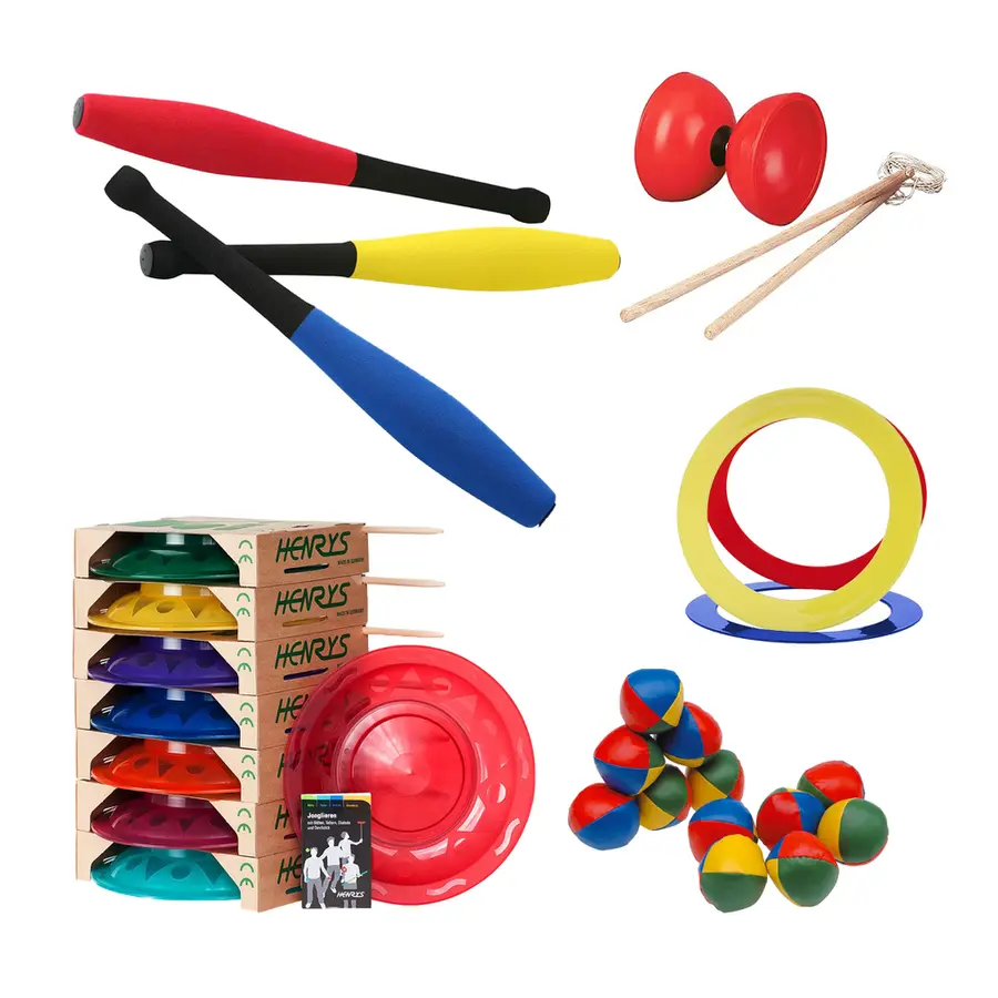 Jongleringsset för idrotssundervisning eller fritids på skolan samt för nybörjare som vill pröva på att jonglera med olika sorters jongleringsutrustning.