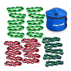 Uppsättning av träningsband för användning i vattenaerobics och aquaerobics. Träningsbanden är idealiska för styrka, stretching och uppvärmningsövningar i vatten. Setet innehåller 25 elastiska rehabband med en praktisk förvaringsväska. Resåren har en ungefärlig längd på 96 cm och har 8 öglor som är perfekta att stoppa in händer och fötter i. Stärk biceps, triceps, axlar, lår, buk, säte och rygg på ett försiktigt sätt i poolen. Perfekt uppsättning träningsband i tre olika motståndsnivåer för grupplektioner i poolen.