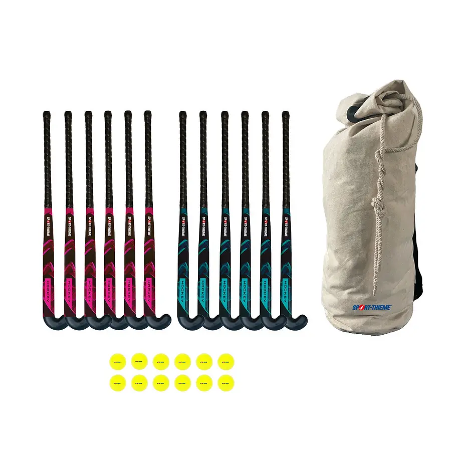 Sport-Thieme Match landhockeyset med 12 klubbor och 12 bollar. Det är robusta klubbor som passar för användning i skolor och föreningar. klubborna är lämpliga för både höger- och vänsterhänta. Halksäker greppband på skaftet ger ett bra grepp.