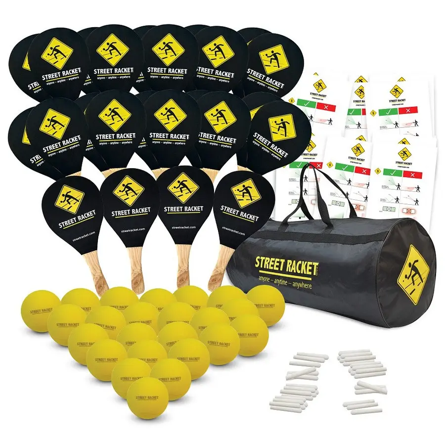 Streetracket eller streettennis är ett mycket praktiskt spel då du inte behöver något nät. Lätta och smidiga rack i trä samt skumtennisbollar för spel på hårda underlag både ute och inne. Streetracketkonceptet passar mycket bra som tex rastaktivitet. Banan ritas enkelt upp med de medföljande gatkritorna. Inget nät krävs. Det går bra att ha många spelare på varje plan. Du kan variera spel och planer i det oändliga. Spela rundtennis eller dubbel eller med många spelare på varje planhalva. Variationerna är många!