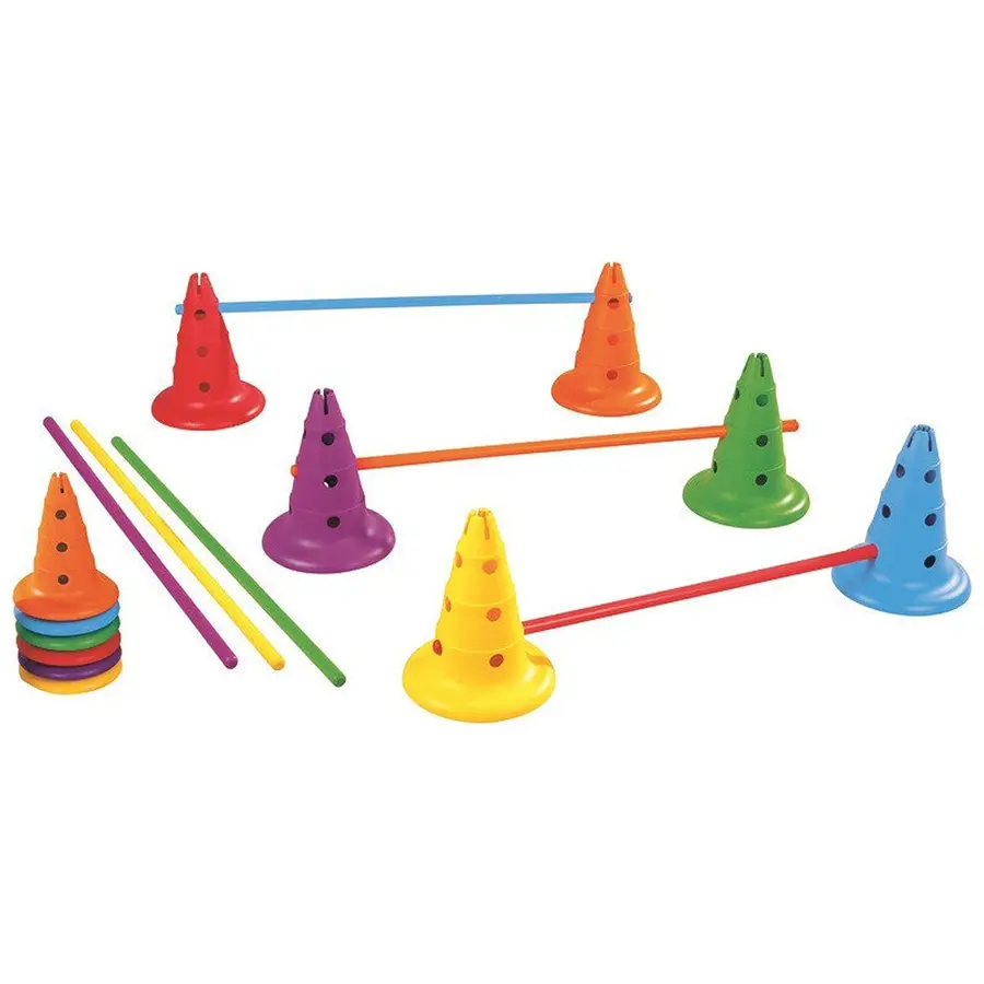 Hinderset / häckar till barn för lek och aktivitet. Perfekt för t ex hobby horsing / käpphästhoppnning. Markeringskonerna är gjorda av solid plast och har hål så att man göra häckar/hinder. Man kan därför göra häckar på 4 olika höjder. Konerna har 3 hål, i tillägg kan stängerna placeras på toppen. Käpparna har svetsade ändar som inte kan rivas av. Setet kan även användas utomhus om vintern och det är möjligt att sätta ringar på toppen av konerna, se tillbehör.