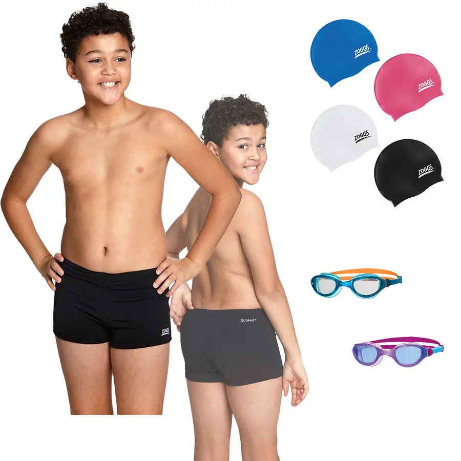 Set med badshorts, simglasögon och badmössa i klassisk design passande för pojkar från 5 år och uppåt. Vi rekommenderar användning av badbyxor istället för badshorts för pojkar, då badbyxorna sitter bättre och luftfickor inte samlas i shortsen.